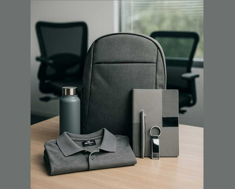 This premium combo set includes a Laptop Bag, Diary, Pen, Keychain, 100% Cotton T-shirt, and a 750ml Steel Bottle, designed for a complete work and lifestyle experience. The laptop bag ensures safe and stylish carrying of your device, while the diary and pen help you stay organized and productive. The keychain keeps your essentials secure and easily accessible. The soft cotton T-shirt adds comfort to your daily wear, and the steel bottle keeps your beverages fresh throughout the day. Crafted with high-quality materials, this combo is perfect for office use, travel, or as a thoughtful gifting option.